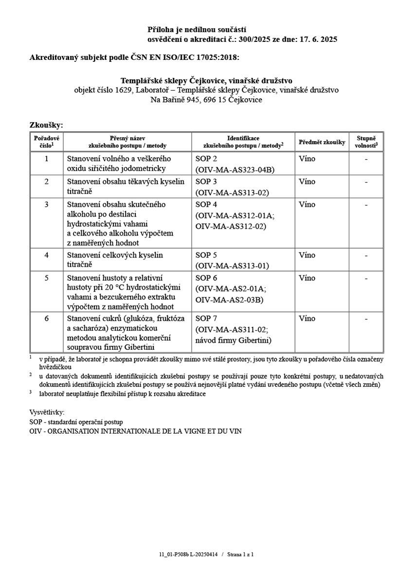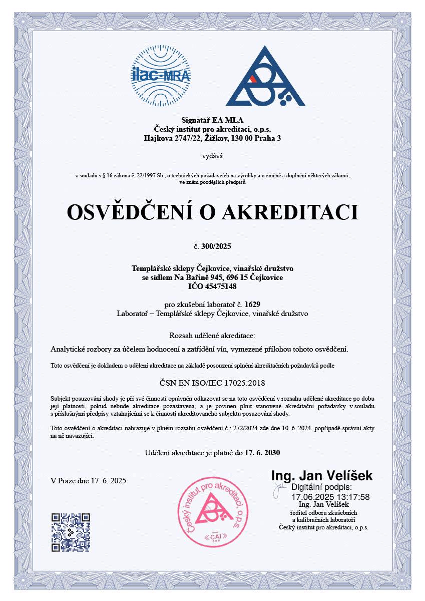 Templářské sklepy Čejkovice, vinařské družstvo je vlastníkem Osvědčení o akreditaci k provádění analytických rozborů za účelem hodnocení a zatřiďování vín a může tedy provádět rozbory pro vinaře žádající o zatřídění vín na SZPI.
